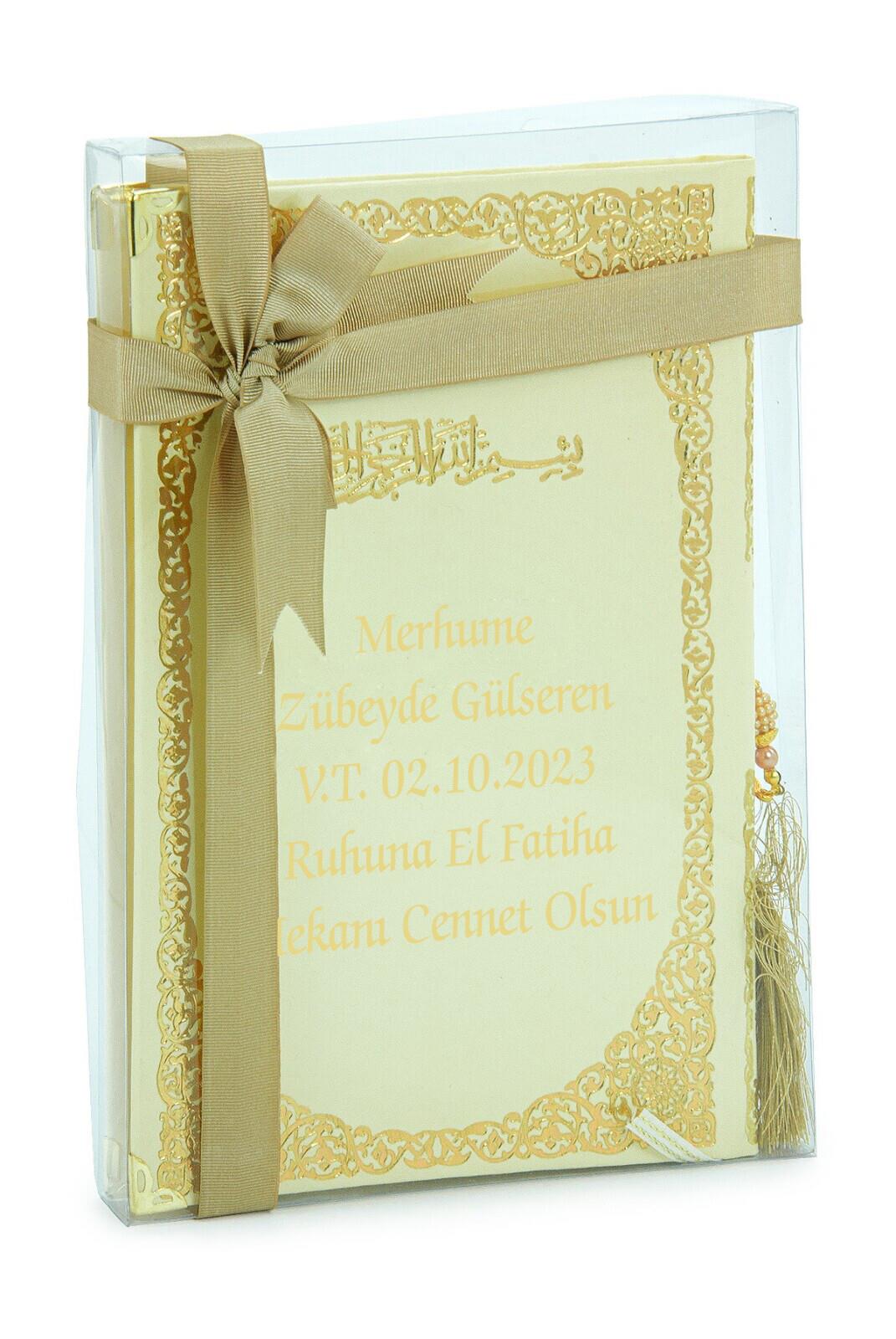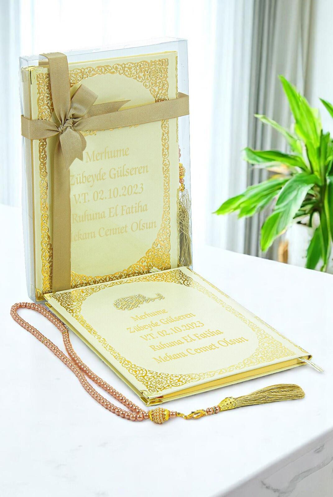 İsim Baskılı Yaldızlı Deri Ciltli Yasin Kitabı - Orta Boy - Şeffaf Kutulu - İnci Tesbihli - Kurdelalı - Krem Renk